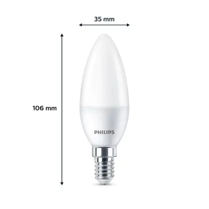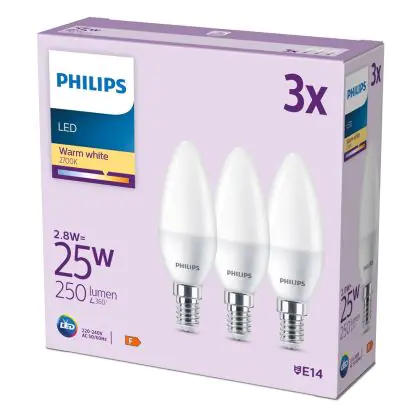 Risparmierai fino al 90% sui costi energetici e di mantenimento, grazie al basso consumo di energia assorbita dai 3W e ad una vita media utile di 15000 ore. A confronto: le lampade ad incandescenza tradizionali durano solamente 1000 ore. L’installazione delle lampadine LED è molto semplice: basta svitare le vecchia lampadina E14 a freddo ed avvitare la nuova lampada Philips Candela. Questo prodotto possiede la garanzia di qualità offerta da Philips e prezzi accessibili che partono da . Potrai utilizzare queste lampade usufruendo della Garanzia Totale Lampadadiretta.it di 2 anni.