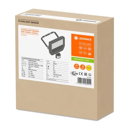Descrizione Ledvance Proiettore LED Sensor GEN 3 Nero 20W 2200lm 100D - 830 Luce Calda | IP65 - Sensore di movimento e luce - Simmetrico - Sostitutiva 50W