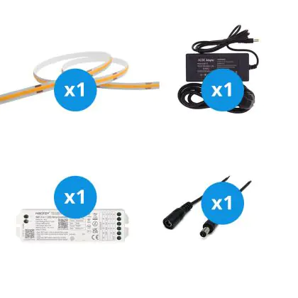 Il grande vantaggio di questo kit completo è che include tutti gli accessori necessari per installare il nastro LED a casa o in azienda. Vi forniamo il materiale necessario per installare il nastro LED. Poi si collega il tutto a una presa elettrica standard. Troverete tutte le informazioni necessarie nel nostro blog sull'installazione. Il kit comprende: