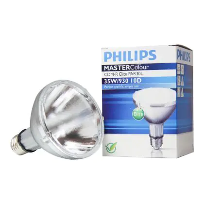 Le Philips CDM-R Elite 35W 930 E27 PAR30L 10D (MASTERColour) sono lampade a scarica compatte ad alogenuri metallici in ceramica dotate di riflettore. Queste lampade, note per la loro elevata efficienza, hanno una potenza pari a 35W e presentano un attacco del tipo E27. Presentano una vita media pari a 15.000 ore. L'indice di resa cromatica delle Philips CDM-R Elite 35W 930 E27 PAR30L 10D (MASTERColour) si assesta nell'intervallo di 90-100Ra: questo indica che i colori e le caratteristiche degli oggetti illuminati vengono esaltati incredibilmente.