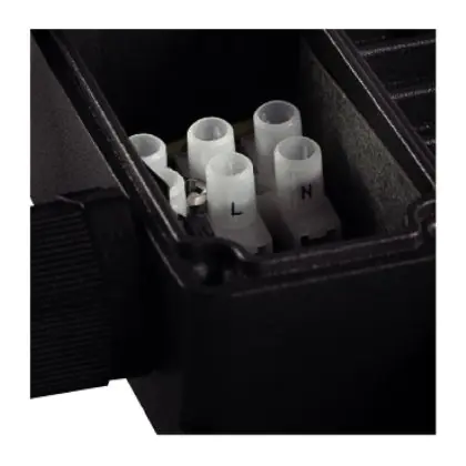 Questo apparecchio può essere usato sia in spazi interni che in spazi esterni, poiché ha indice di protezione contro l'ingresso di acqua e polvere IP65. In generale, un apparecchio con IP44 è resistente a schizzi di acqua e umidità, e può quindi essere installato in spazi esterni molto umidi o esterni riparati, come sono una tettoia. Un apparecchio che invece verrà esposto a intensi getti di acqua deve avere almeno IP54. Questa lampada ha anche un indice di resistenza a urti e impatti di IK06 - 1 Joule